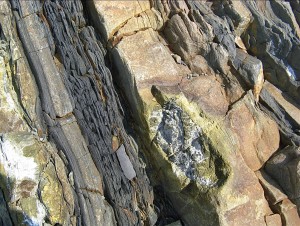 Жила зеленоватой (окрашенной селадонитом?) вулканической породы. Восточные обрывы мыса Фиолент.
