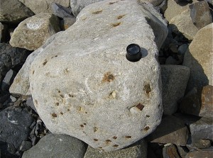 Окатанная глыба габбро-диабаза с включениями кристаллов пирита. Артековский склон.