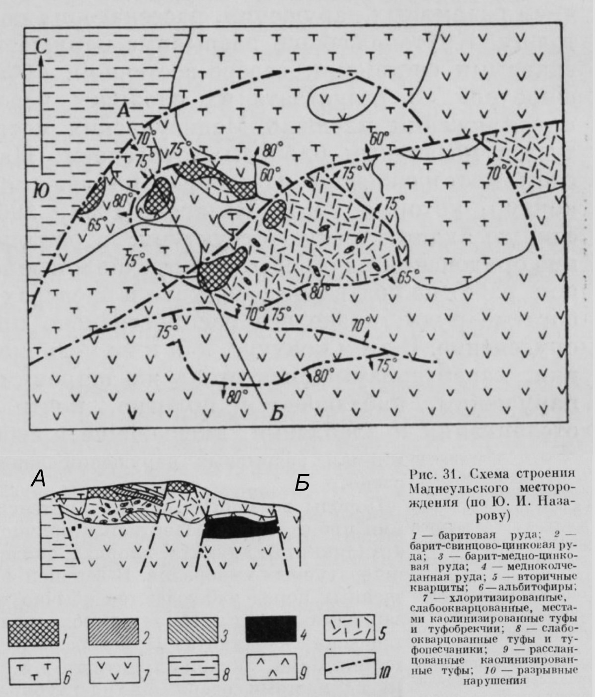 Схема геологического строения Мандеульского месторождения (план и разрез). Рисунок из книги: Сопко И.Ф. Колчеданные месторождения Малого Кавказа. – М.: Недра, 1971, 256 с. Рис. 31, стр. 181