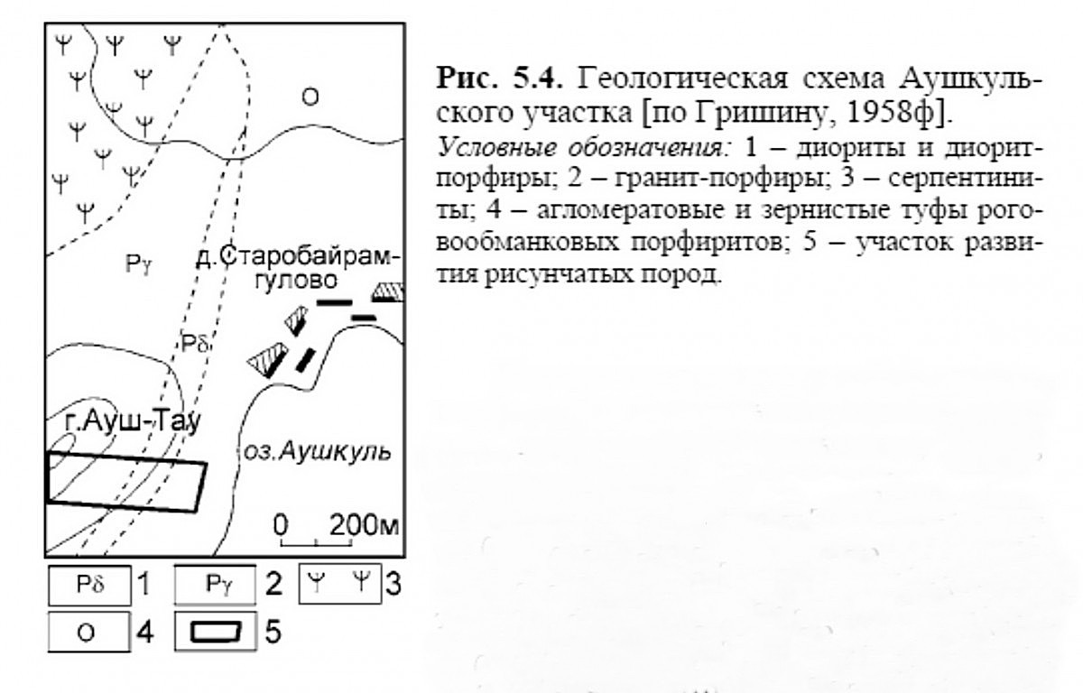 Описание: Геологическая схема Аушкульского участка. Рисунок из книги Д.Н. Салихов, С.Г. Ковалев, Л.А. Шарафутдинова. Полезные ископаемые Республики Башкортостан (декоративно-поделочные камни). - Уфа: ДизайнПолиграфСервис, 2012. 247 с. Рис. 5.4, стр. 170