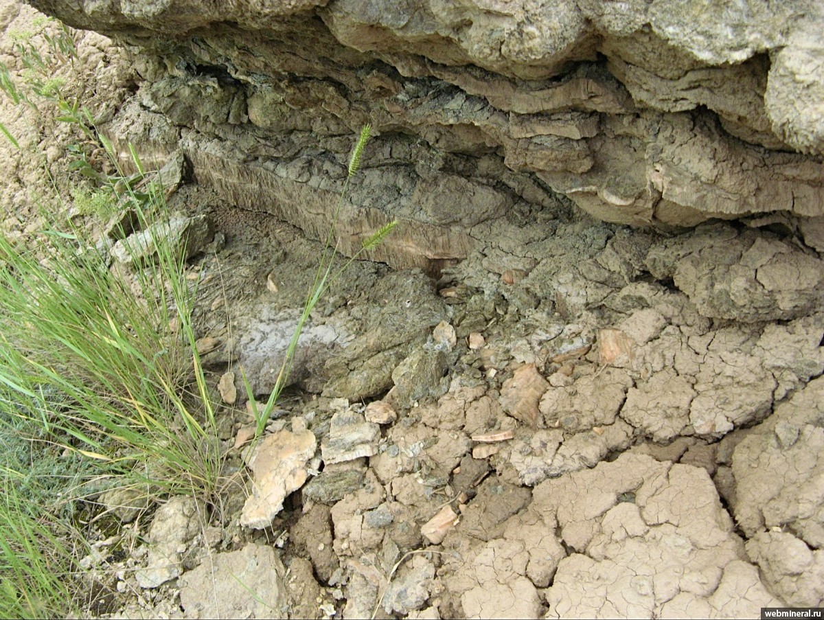 Описание: Выходы жил гипса-селенита в нижней части обнажения Ивано-Дарьевка.