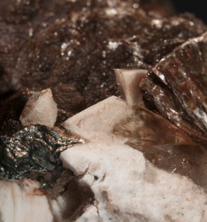 Опал образует прожилки в скарнах месторождения. Цвет минерала белый, до густого розового.