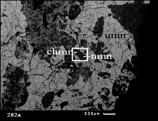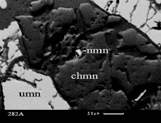Зерно науманнита до 10 микрон в халькомените и умангите. Хим.состав науманнита Ag2.02Se0.98. РЭМ-фото.