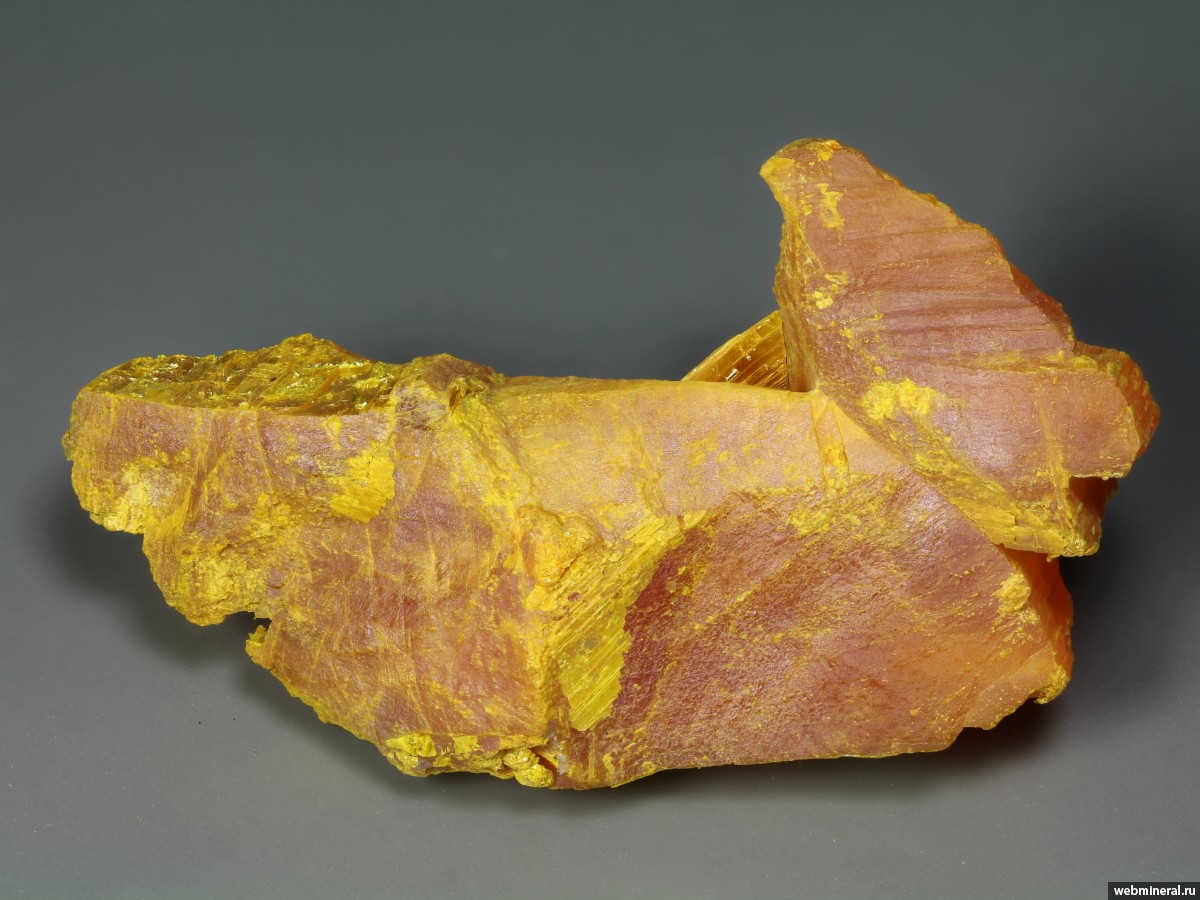 Сросток кристаллов аурипигмента из раздува аурипигментовой жилы в известняках. Поверхности индивидов аурипигмента не совсем соответствуют кристаллографическим, это т.н. индукционные поверхности совместного роста кристаллов в условиях геометрического отбора.