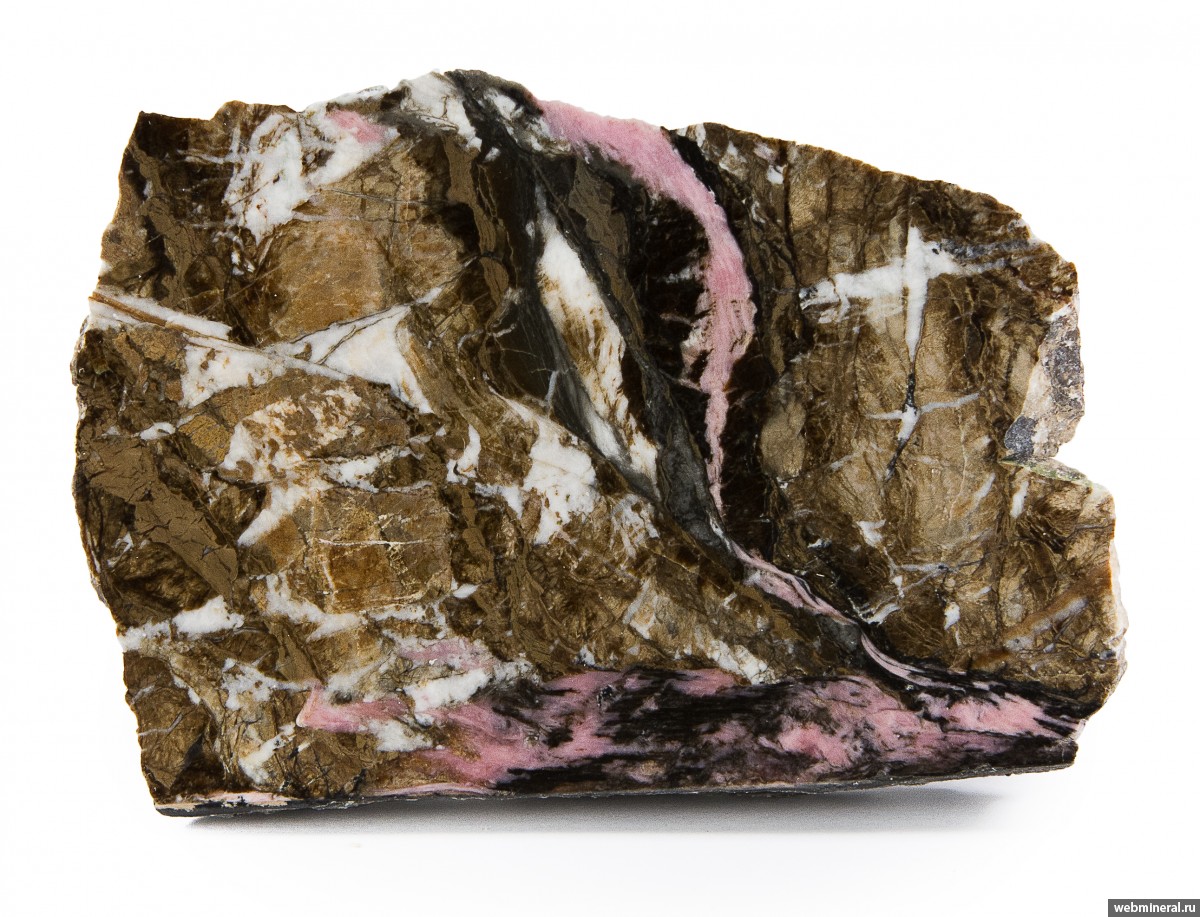 Коричневые прожилки пеннантита в ассоциации с кариопилитом в родохрозит-спессартиновой породе.