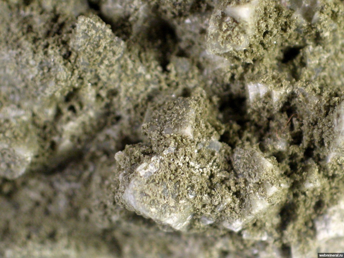 Серовато-зеленый мелкочешуйчатый шамозит на кристаллах ломонтита размером до 1 см. Коллекция Тищенко А.И., обр. № 2015, сбор: 2015 г., Руденко И.Е. (Севастополь).