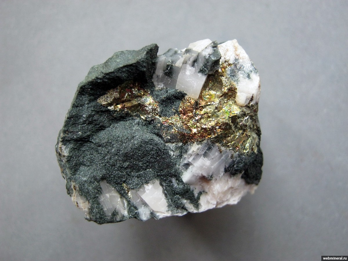 Халькопирит и кальцит в сланцеподобной вмещающей породе.