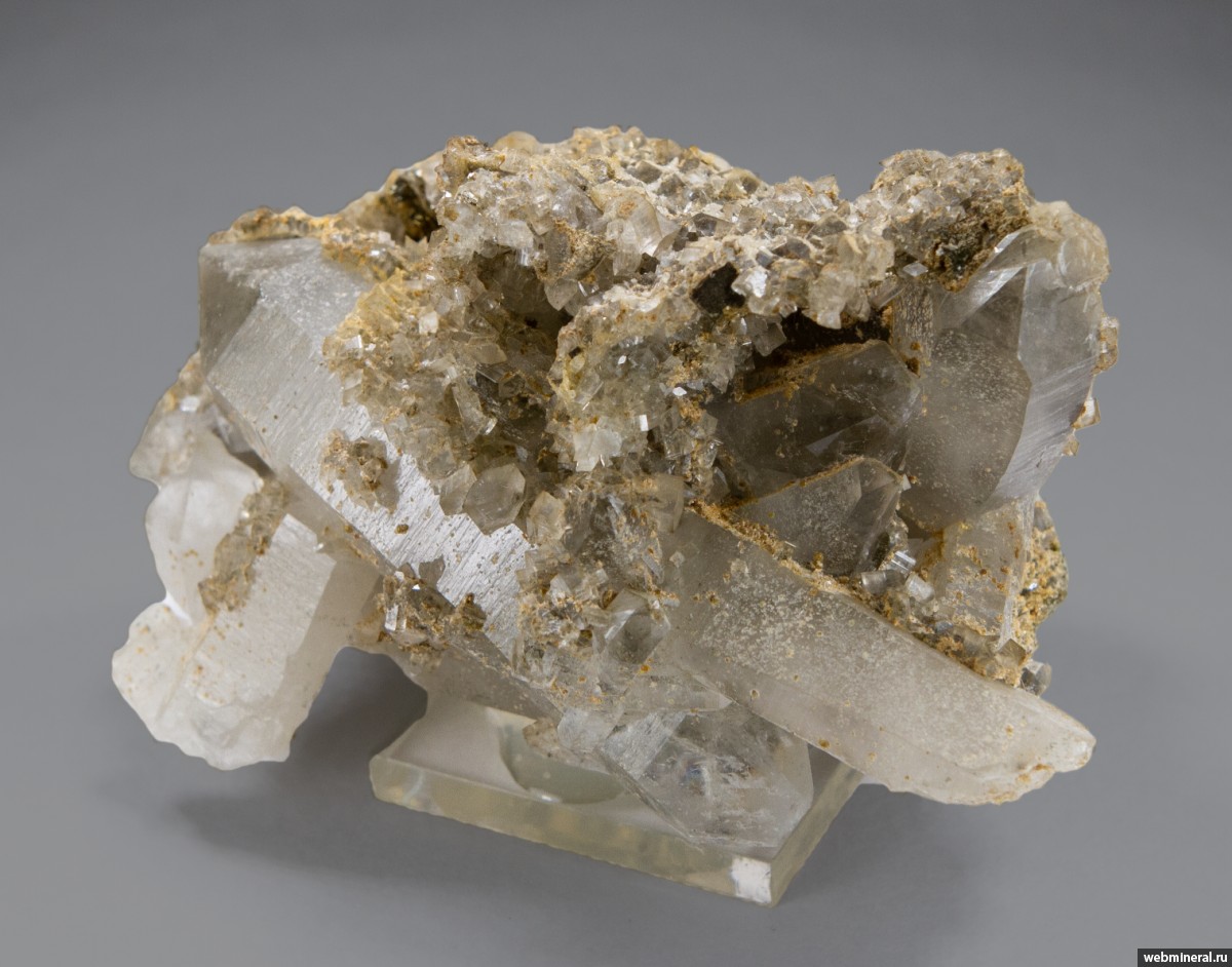 Друза бесцветных призматических и таблитчатых кристаллов бертрандита размером до 5 мм на сростке кристаллов кварца с мелкими кристаллами пирита.