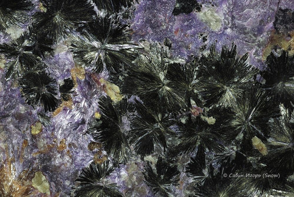 "Солнца" черного эгирина диаметром до 1,4 см, зерна светло-желтого стисиита размером до 4,5 мм и отдельные кристаллы темно-желтого тинаксита в чароите.