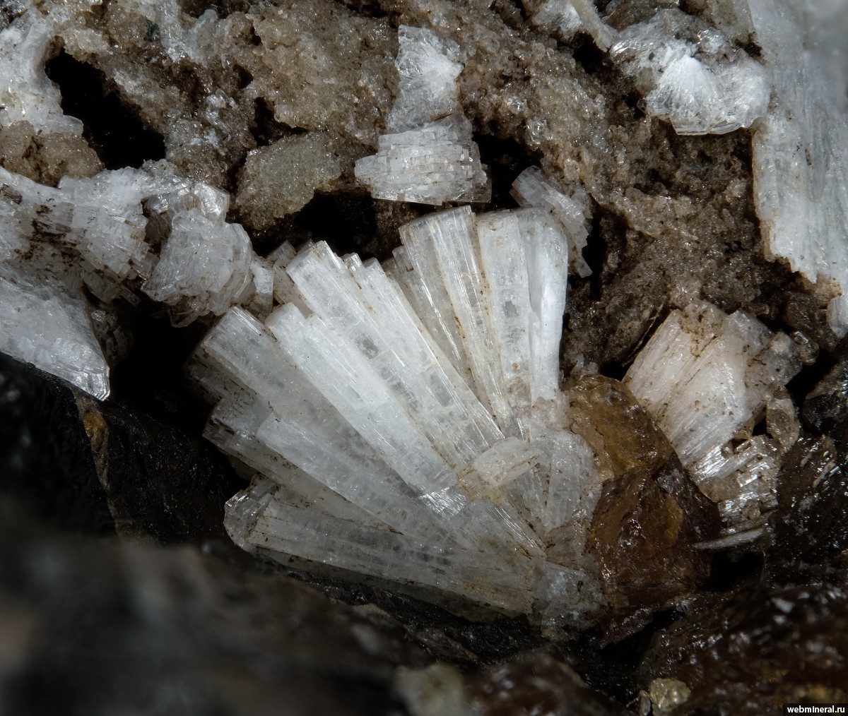 Снопики белого стеллерита размером до 4 мм в полости массивного везувиана.