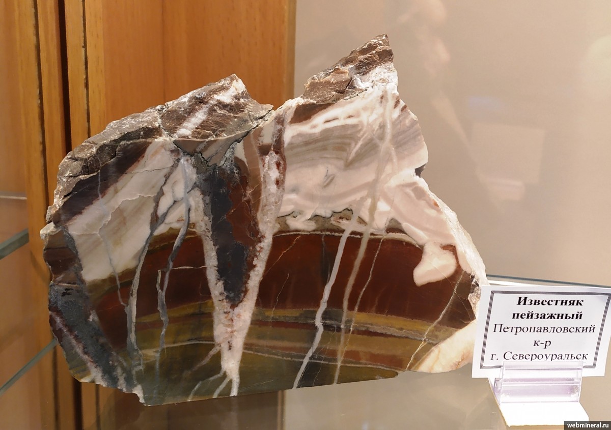 Типичный для месторождения образец пейзажного известняка, контрастно окрашенного гидроокислами железа. Пейзажные известняки Петропавловского карьера, очень похожие на яшмы, часто используются местными камнерезами.