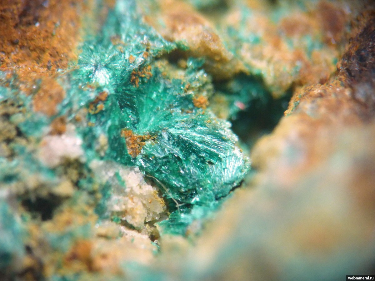 Тонкие прожилки, сферолиты и радиально-лучистые агрегаты малахита в брекчированном ожелезненном кварце. Сбор: 2005 г., Ширкунов Виктор (геолог, Институт минеральных ресурсов, Симферополь).