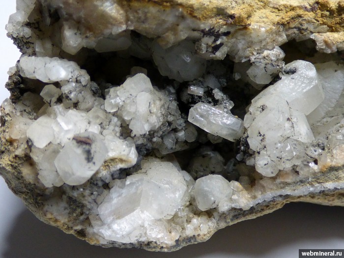 Кальцитовая жила, в пустоте - друза полупрозрачных бесцветных призматически-ромбоэдрических кристаллов кальцита размером до 1 см. Сбор: 2008 г., Тищенко А.И.
