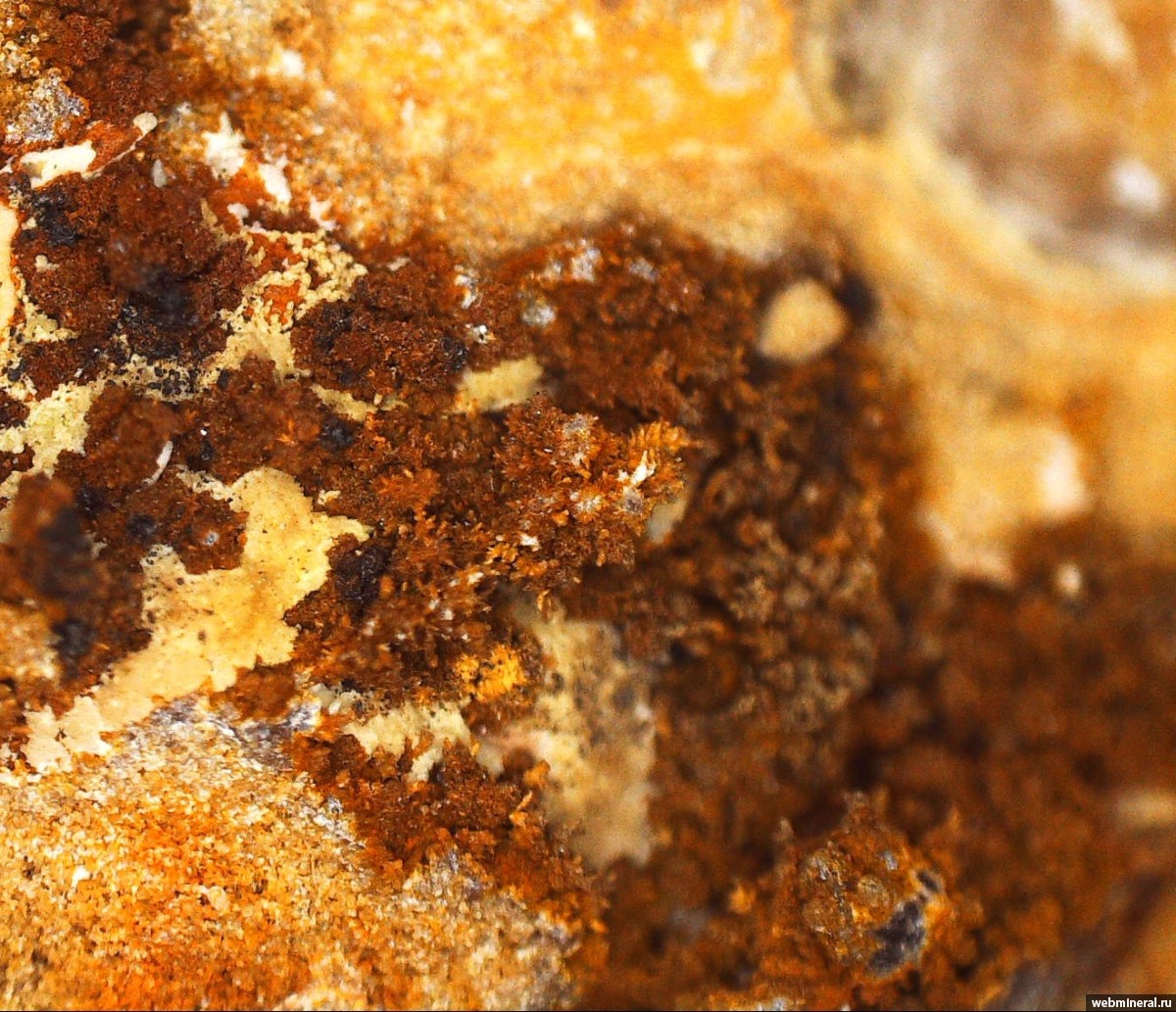 Кристаллы до 1 мм и сростки коричневого миметита в пустотах смитсонитовых каверночек.