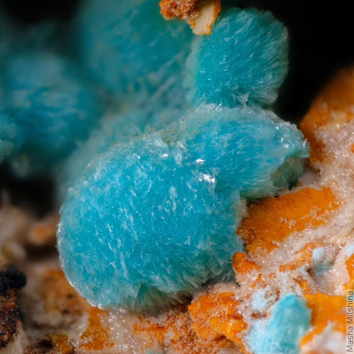 Насыщенно-голубые сферолиты аурихальцита на породе.