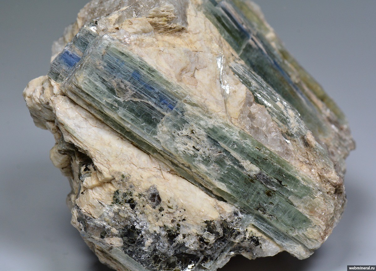 Кристаллы двухцветного (синий и зеленые цвета) и зеленого кианита длиной до 5,6 см на полевом шпате с кварцем.