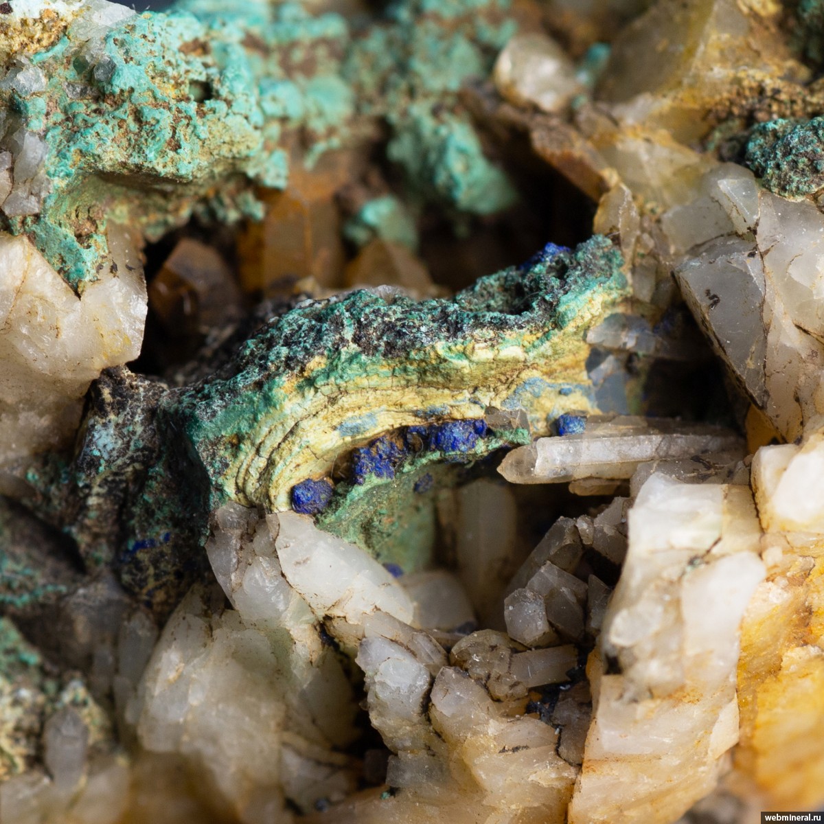 Корочка на кварце, состоящая из чередующихся агрегатов нескольких минералов: малахита (зелёный), цианотрихита (светло-голубой) и азурита (синий).