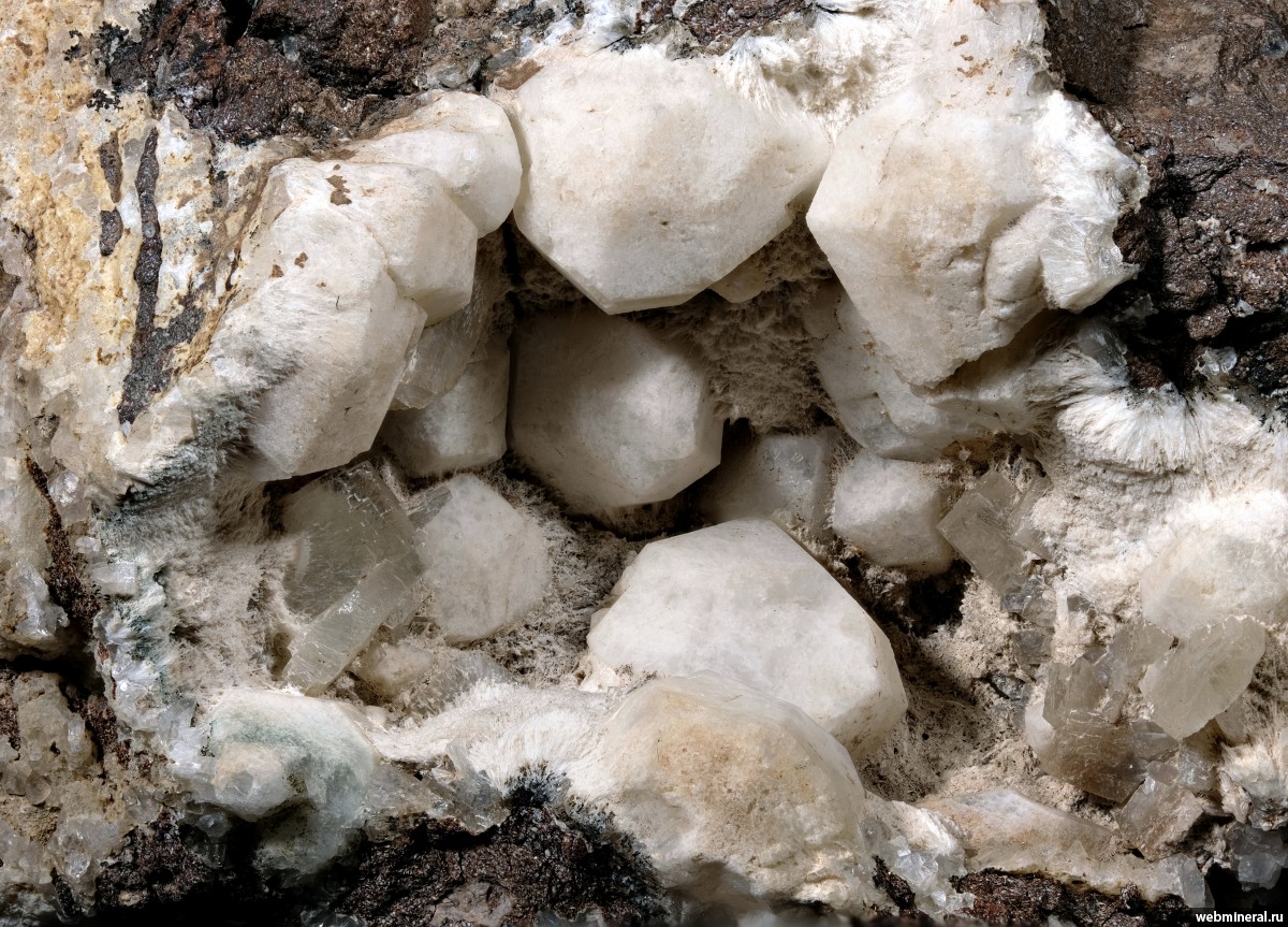 Кристаллы анальцима, волокнистый (тонкоигольчатый) мезолит, прозрачные кристаллы, скорее всего, гейландита (справа и слева) в полости базальтовой миндалины.