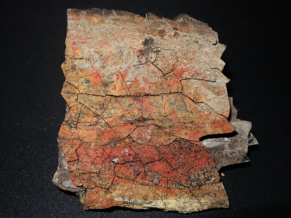 Фрагмент углефицированного древесного остатка, на поверхности – налеты красного порошковатого гематита и светло-желтого натроярозита. Сбор: 11.2022 г., Шибаев Е.А. (Севастополь).