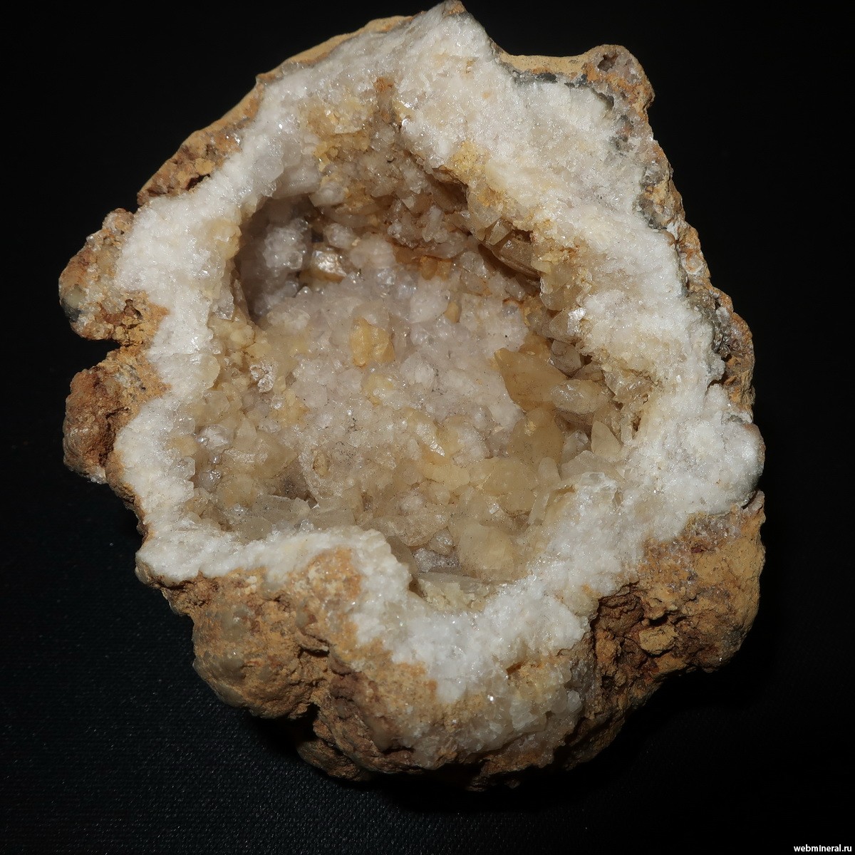 Силицитовая жеода, инкрустированная кристаллами кварца размером до 5 мм с наросшими на него желтоватыми скаленоэдрическими кристаллами кальцита размером до 7 мм. Сбор: 1984 г., Азизов Олег (студент МГРИ).