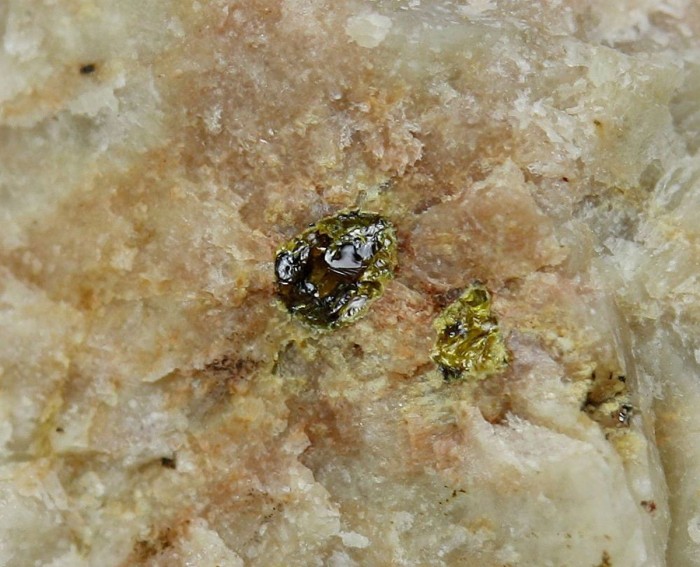Зерна желтовато-коричневого уранпирохлора в светлом полевом шпате.