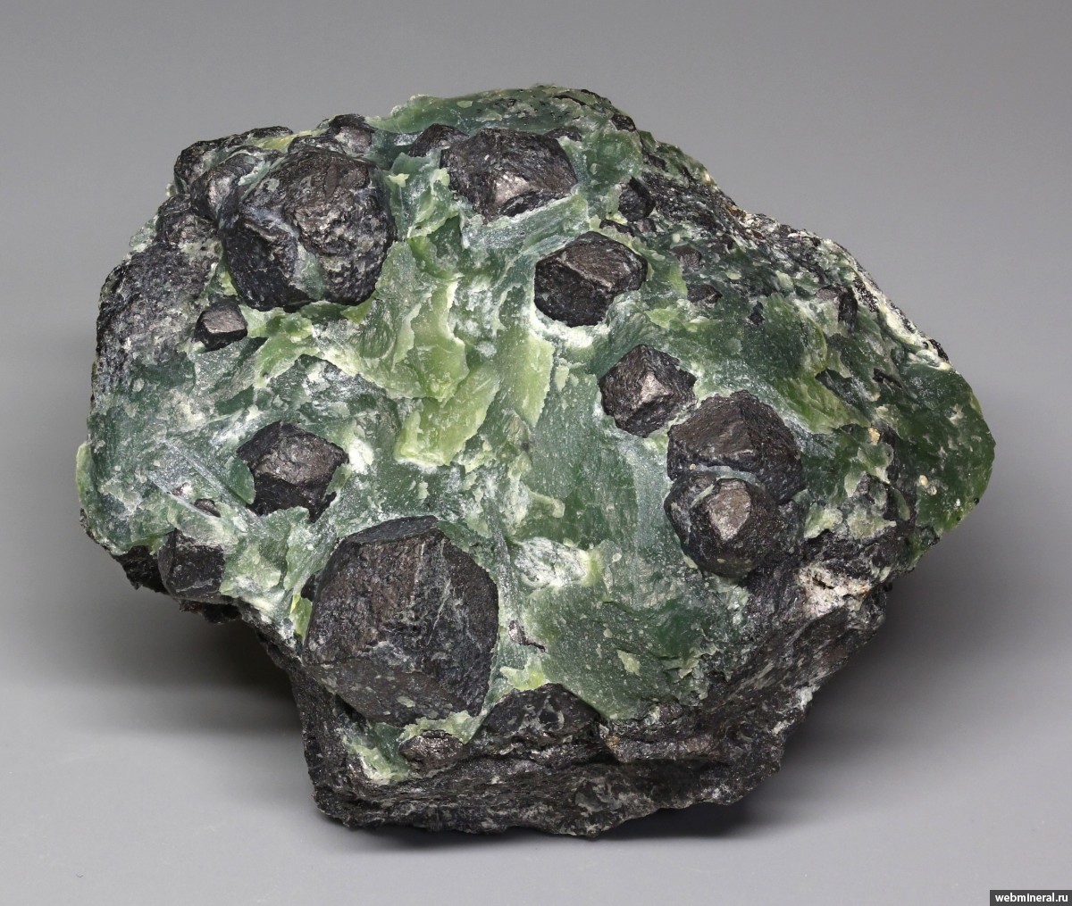 Ромбододекаэдры магнетита (разм. до 1,5 см) в зеленом скрытокристаллическом серпентине.