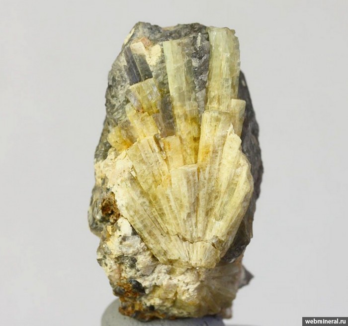 Радиальный сросток призматических кристаллов желтого берилла в сером кварце.