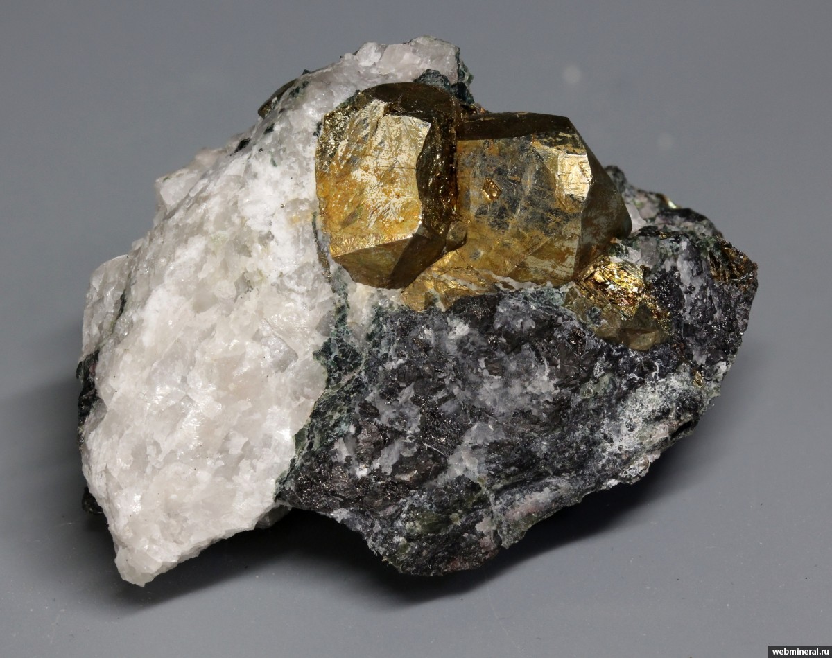 Пара сложноограненных кристаллов пирита (разм. 1 см) в магнетит-кальцитовой скарновой породе.