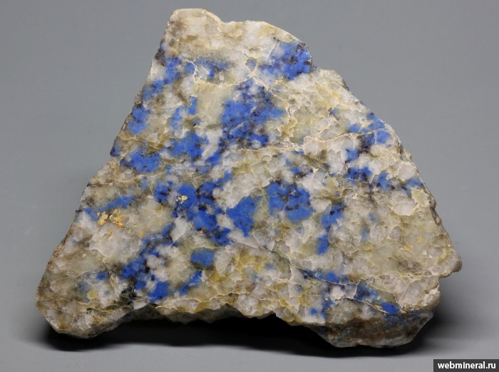 Скопления синего дюмортьерита в метасоматической породе типа вторичного кварцита сложенной серым кварцем и скоплениями желтоватого серицита. Находка - 2023 год.