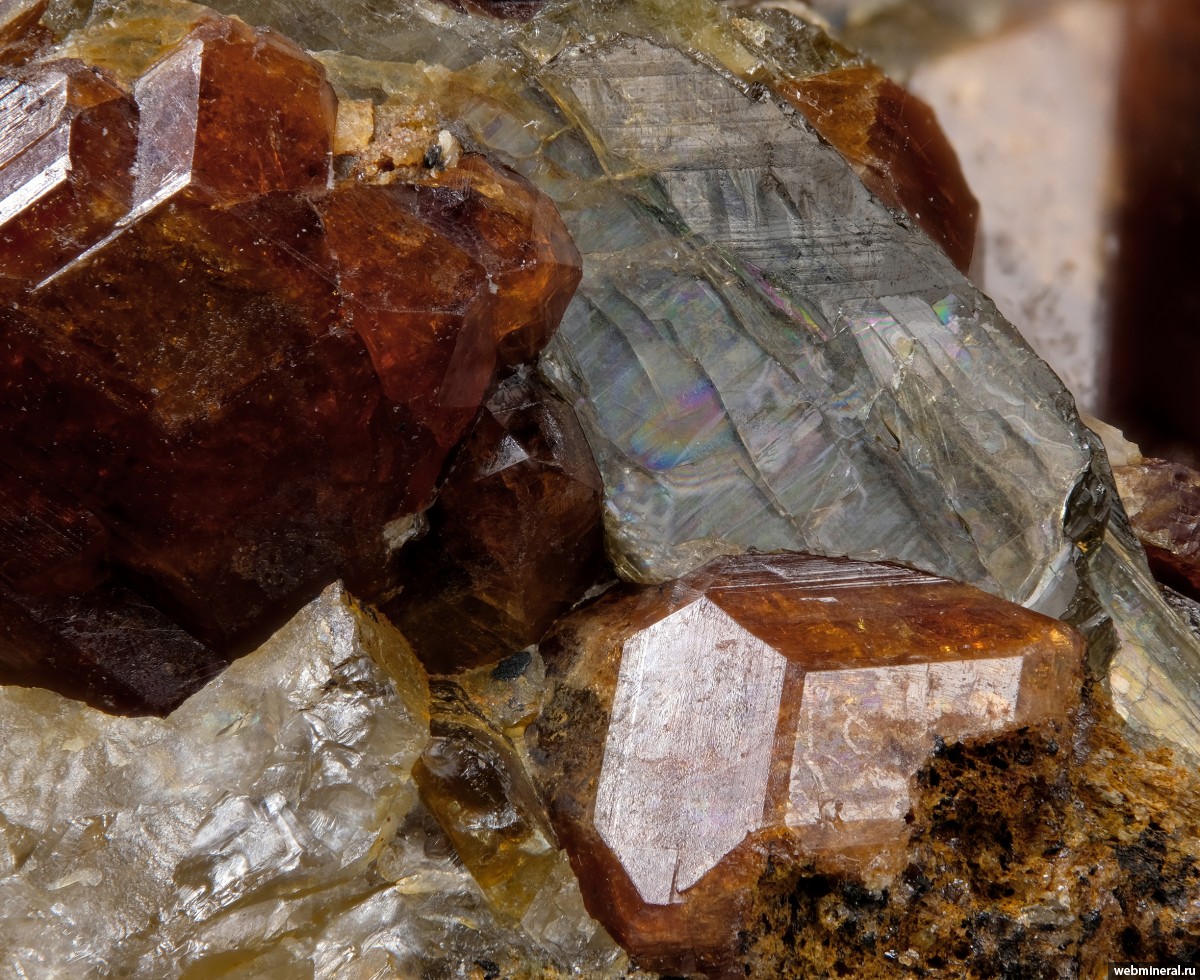 Сросток кристаллов красно-коричневого гроссуляра размером до 15 мм и фрагменты кристаллов сероватого клиноцоизита на скарновой породе. Из коллекции М.Л. Учителя.