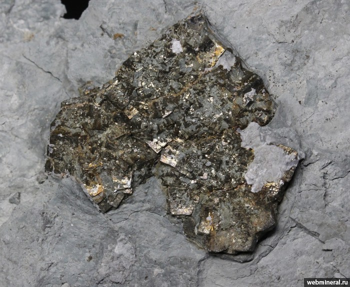 Плоская конкреция пирита сложенная его небольшими кривогранными кристаллами кубической формы в серой загипсованной глине. В правой части конкреции на пирит нарастает тонкая корочка светло-серого гипса. Образец не представляет большой минералогической ценности, но это самое крупное скопление пирита встреченное на месторождении за его несколько посещений. Находка - 2023 год.