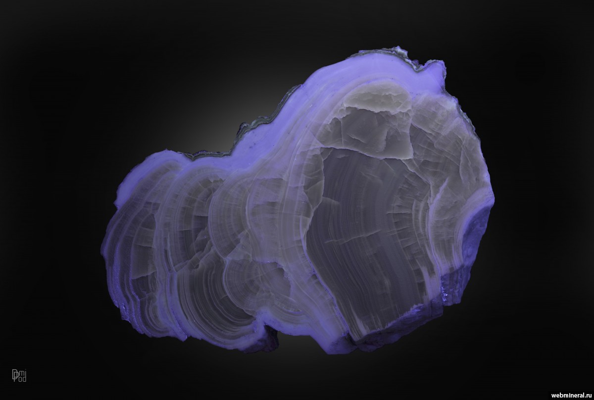Полированный спил сталактита сложенного полосчатым мраморным ониксом. В длинноволновом УФ наблюдается слабое зональное зеленоватое свечение. Находка - 2024 г.