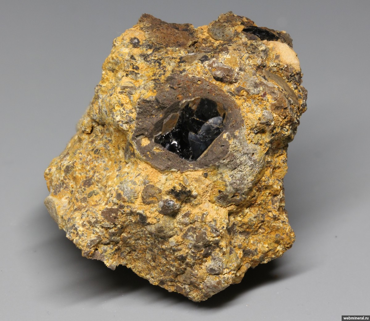 Округлое зерно черного авгита (разм. 1 см), окруженное корочкой базальта в вулканической брекчии, сложенной обломками базальта, окружающих осадочных пород, мелкими зернами оливина, пиропа и др.
