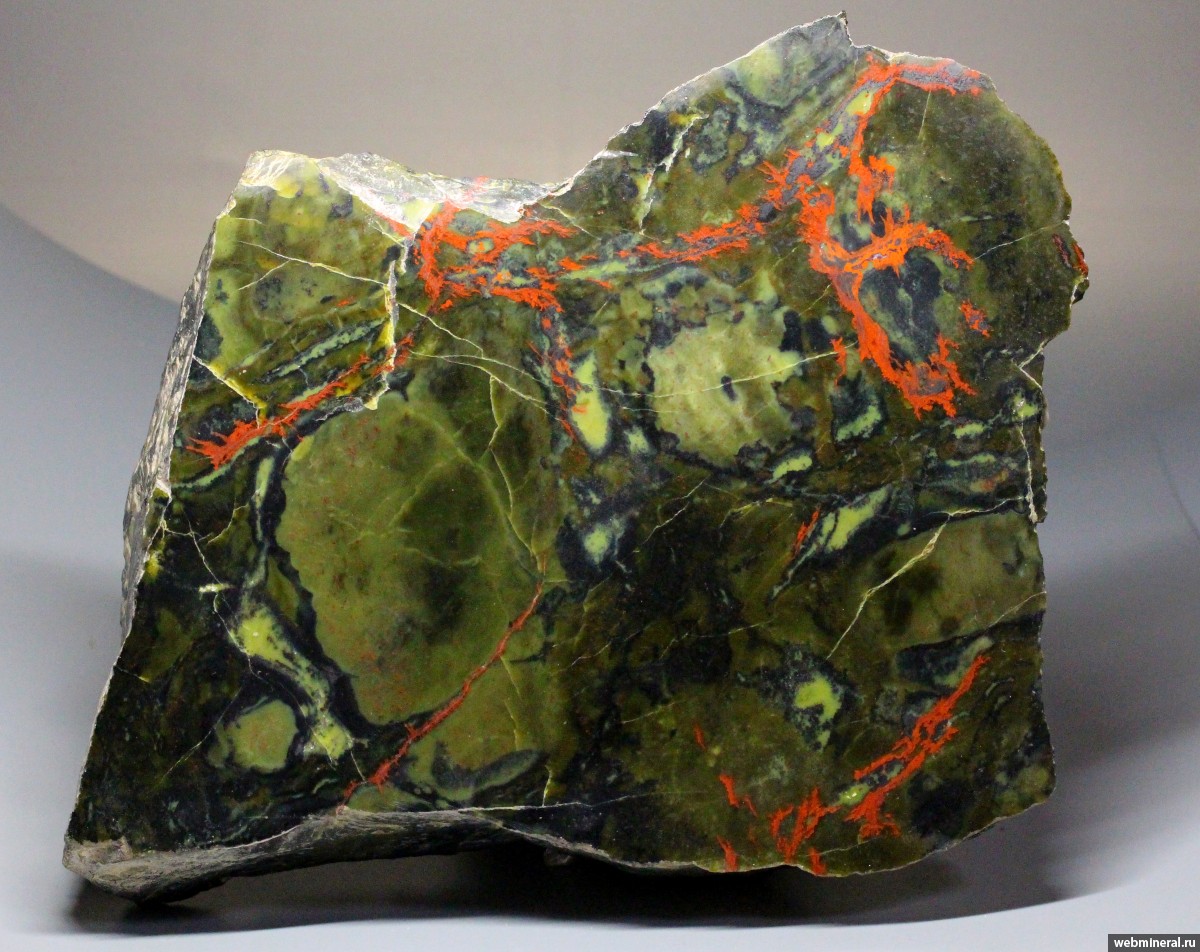 Крупная приполированная пластина скрытокристаллического серпентина (офита) из рудных скарнов месторождения. Пестроокрашенные тейские серпентины находят применение в качестве недорогого поделочного камня. Подобный материал в изобилии встречался во время проведения горных работ в карьере месторождения.
