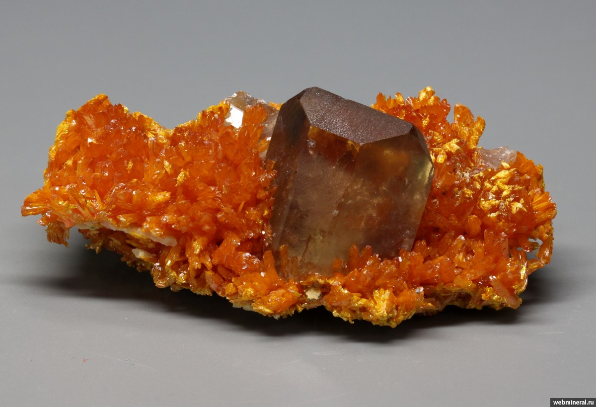 Кристалл прозрачного чайного барита высотой 2 см на щетке аурипигмента. Старые сборы.