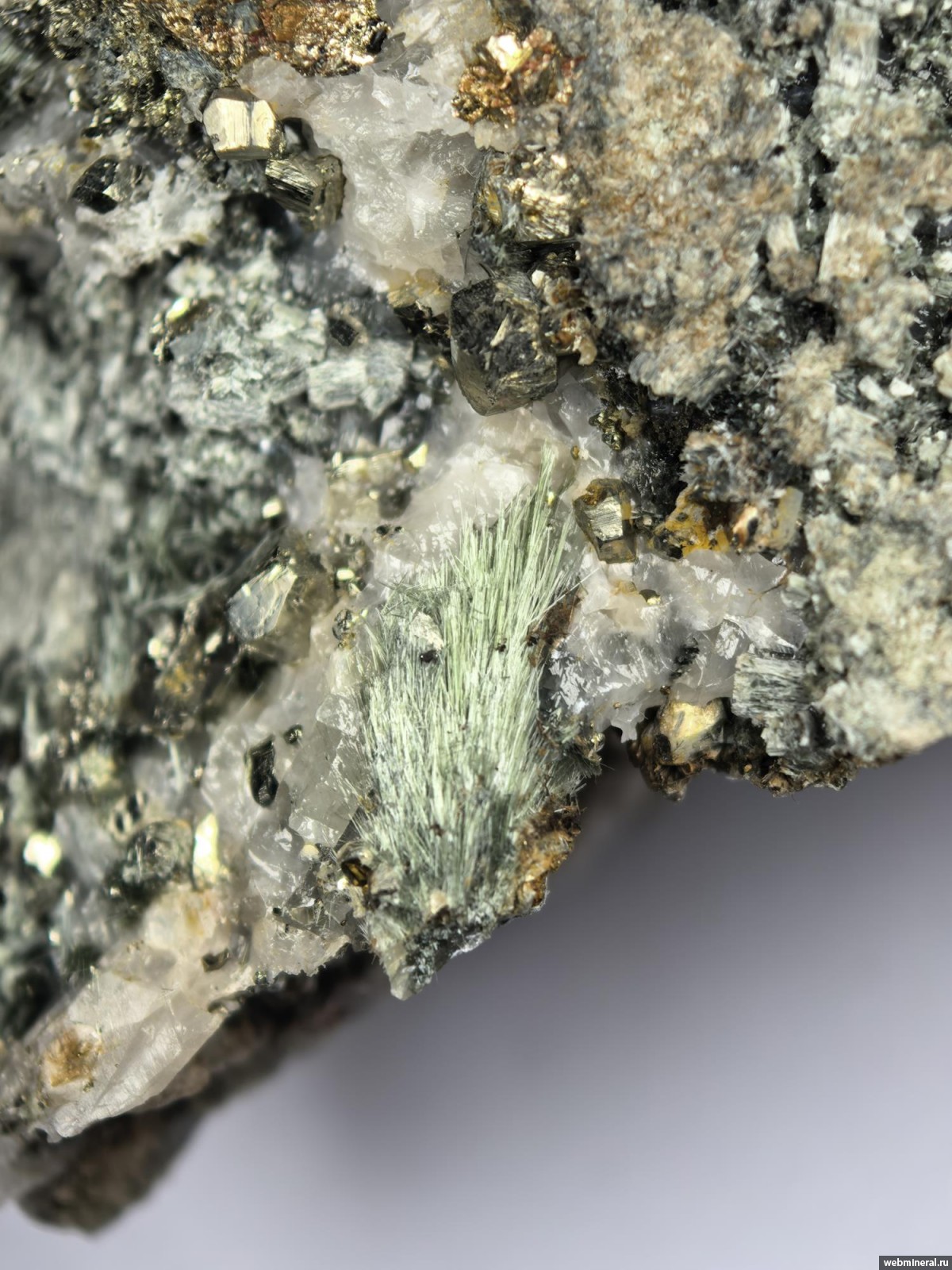 Фотография минерала Актинолит, Пирит, Кварц. Хепоселькя месторождение.