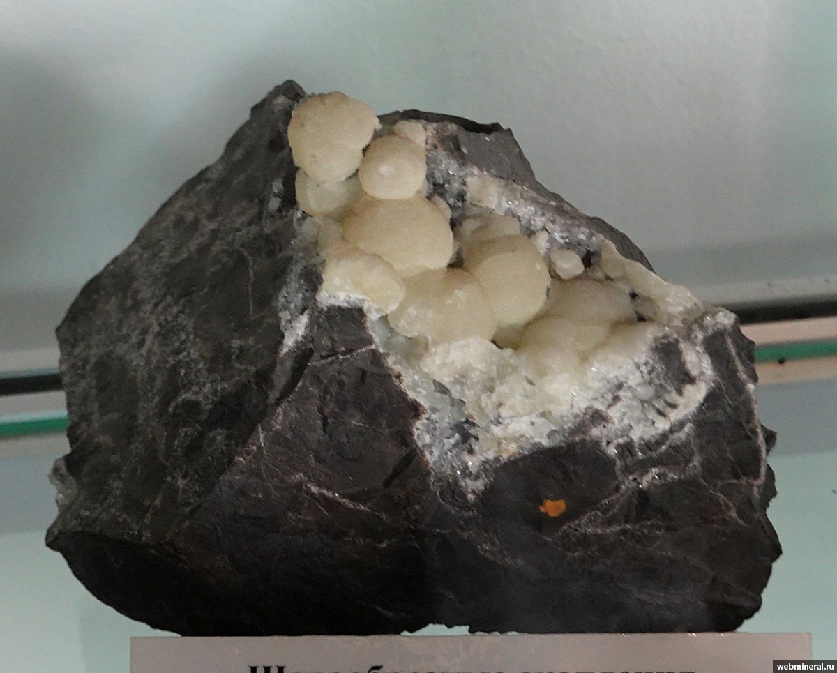 Сферолиты белого кальцита на стенке полости в глинисто-сидеритовой конкреции.