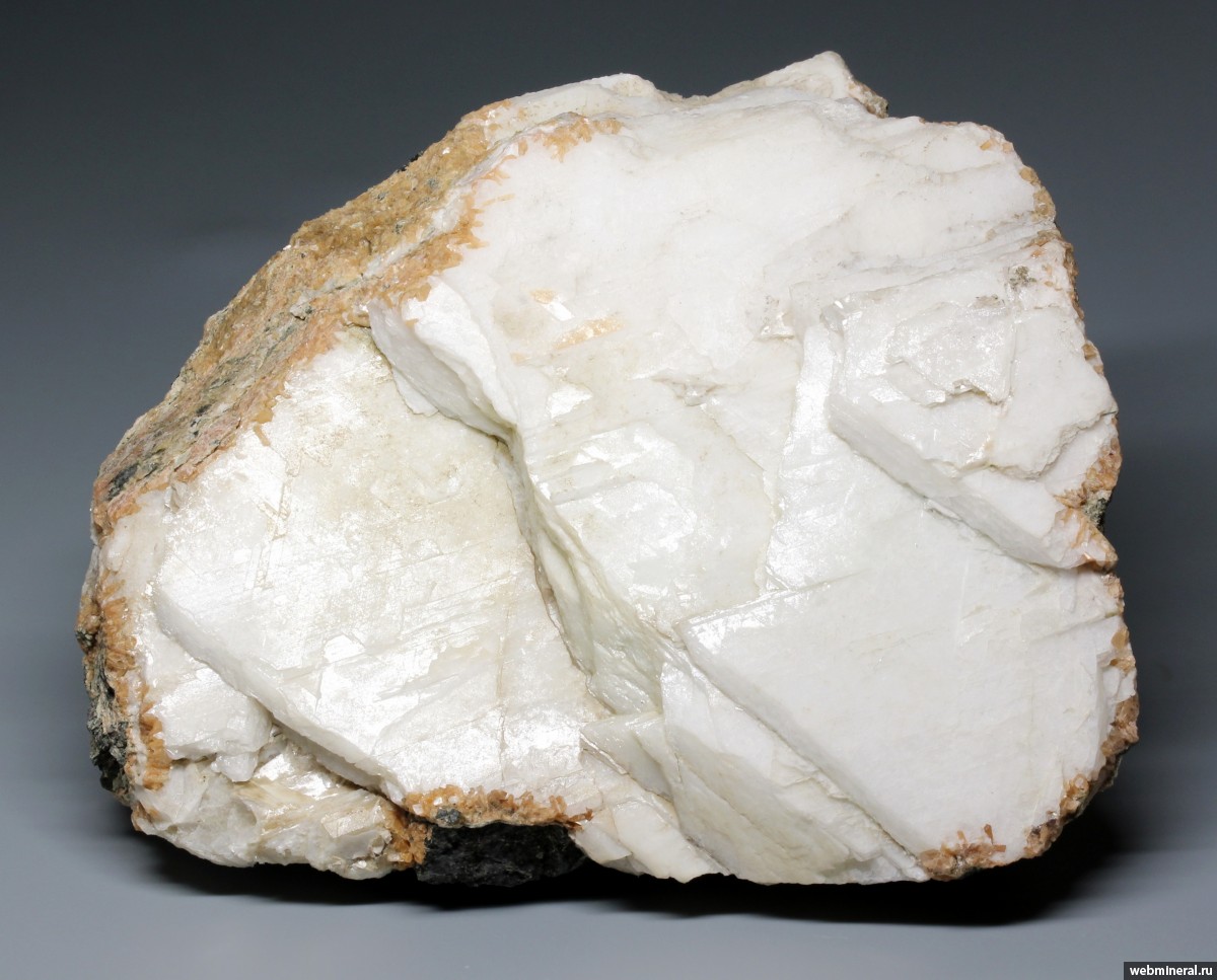 Крупные пластинчатые кристаллы белого кальцита полностью заполнившие полость в матаморфизованных осадочных породах. От вмещающей породы кальцит отделен тонкой кристаллической корочкой оранжевого стильбита. Находка - 2025 год.