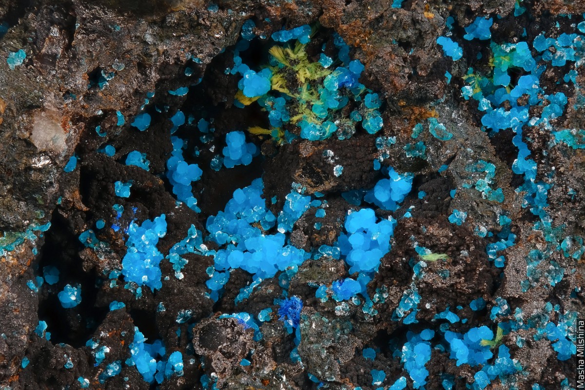 Ярко-голубые сферолиты рихельсдорфита на породе. Находка - 2025 год.