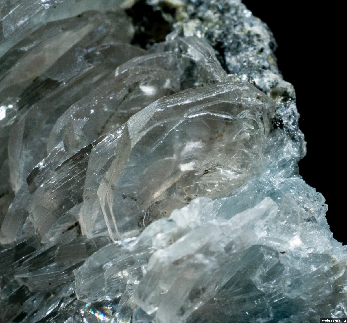 Полихромный - голубоватый и розоватый - пластинчатый кристалл брусита.