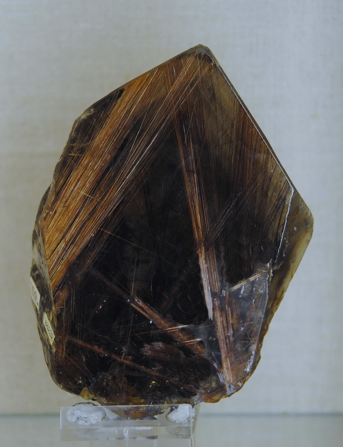 Приполированный срез прозрачного кристалла дымчатого кварца с включениями пучков игольчатых кристаллов рутила. Минералогический музей им. Ферсмана А.Е., образец № 84232, Куварзин А.И., 1986 год. Фото - 2015 г.