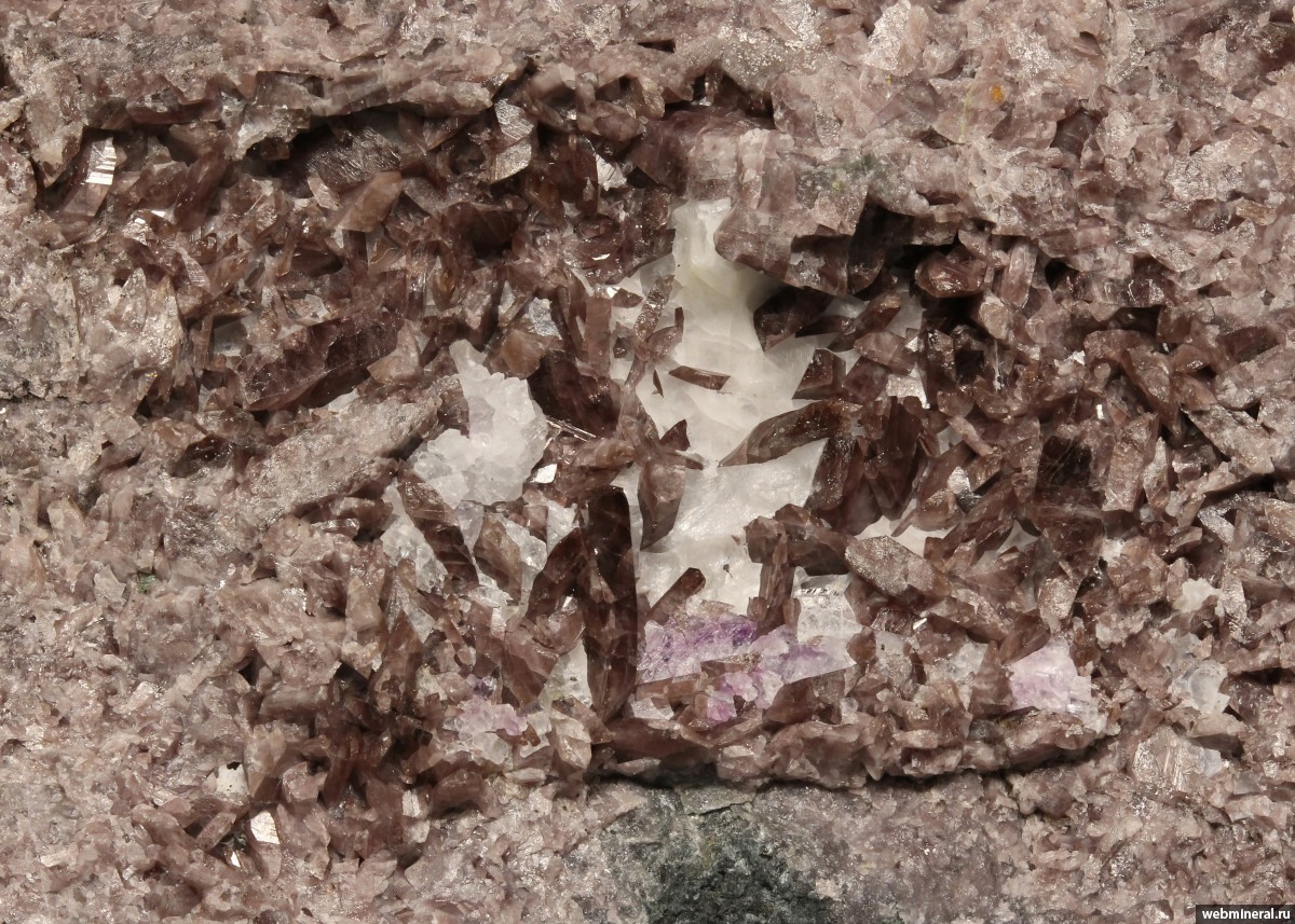 Щелевидная полость в аксинитовом прожилке, рассекающем скарн, стенки которой покрыты небольшими (длиной до 1 см) клиновидными кристаллами коричневого аксинита в ассоциации с зернами сиреневого и бесцветного флюорита и белым кальцитом (изначально заполнявшим всю полость). Находка - 2025 год.
