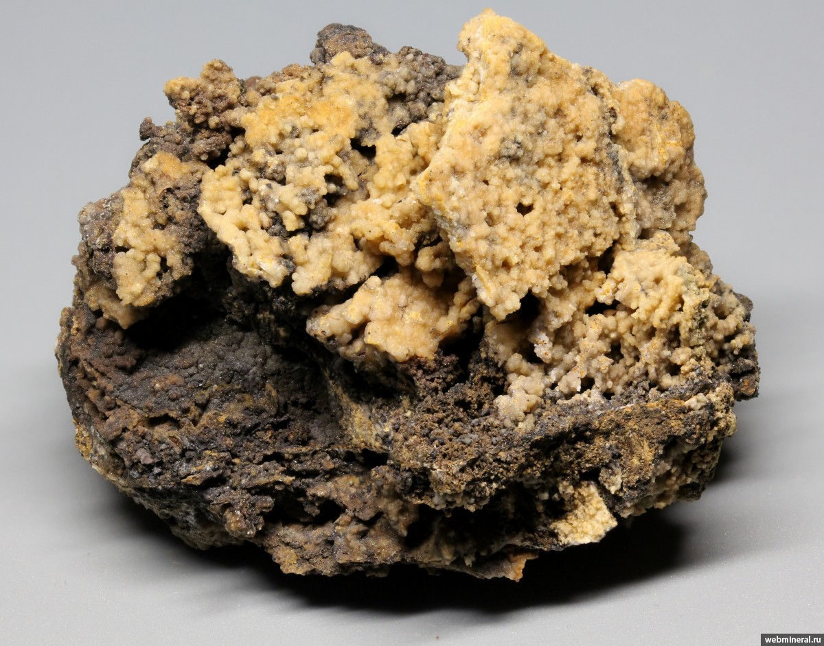 Кавернозный агрегат, сложенный тонкими корками расщепленных кристаллов смитсонита (местами пигментированных гидрокислами железа). Находка - 2025 год.