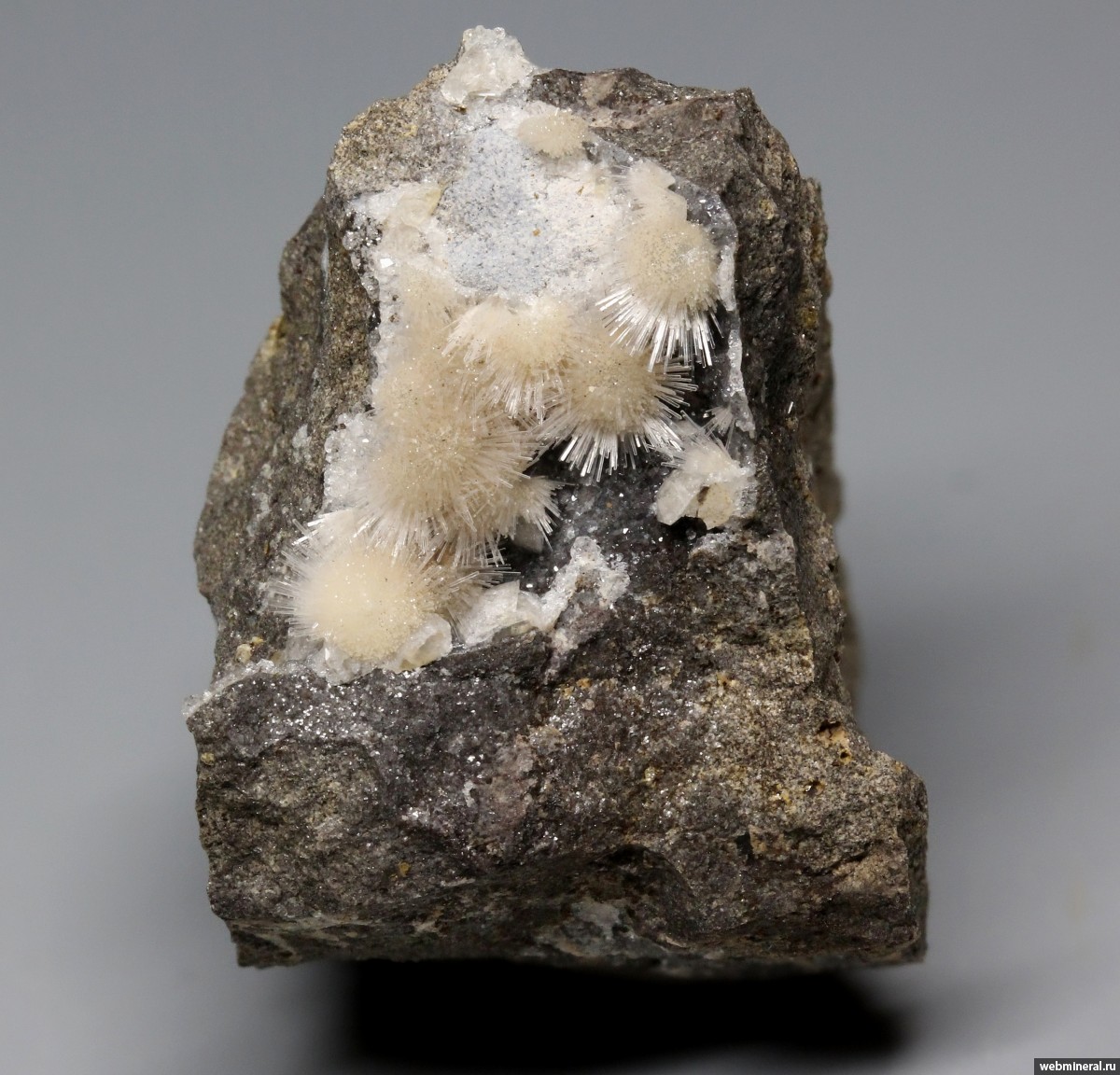 Пучки тонколучистых кристалликов натролита на покрытой корочкой анальцима стенке полости в базальте. Находка - 2025 год.