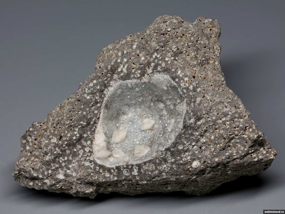 Специфически сдвойникованные кристаллы шабазита (разн. "факолит") размером 3-4 мм на покрытой корочкой анальцима стенке миндалины в базальте. Находка - 2025 год.