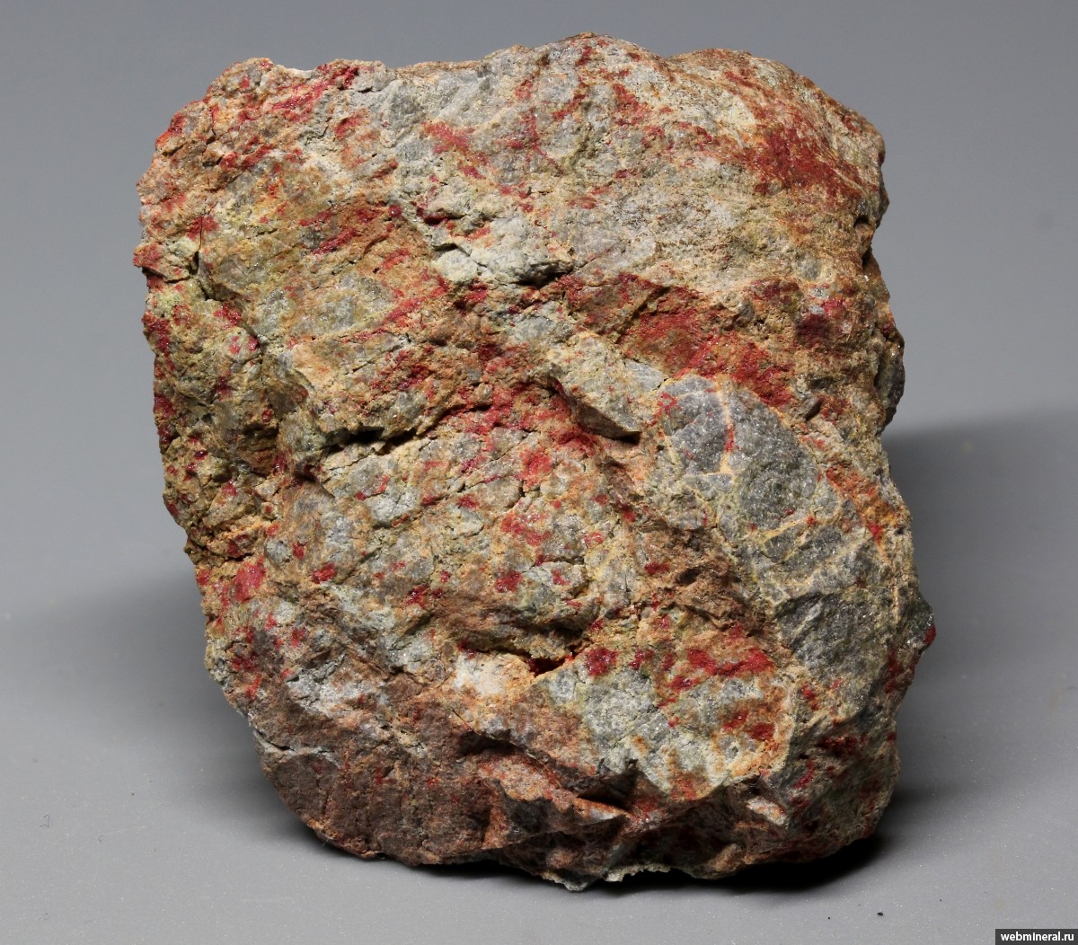 Вкрапленность киновари в разбитом сетью кальцитовых прожилков известняке. В редких щелевидных пустотах кальцитовых прожилков наблюдаются мелкие (до 1 мм) ограненные кристаллики киновари и бесцветного кварца. Находка - 2025 год.