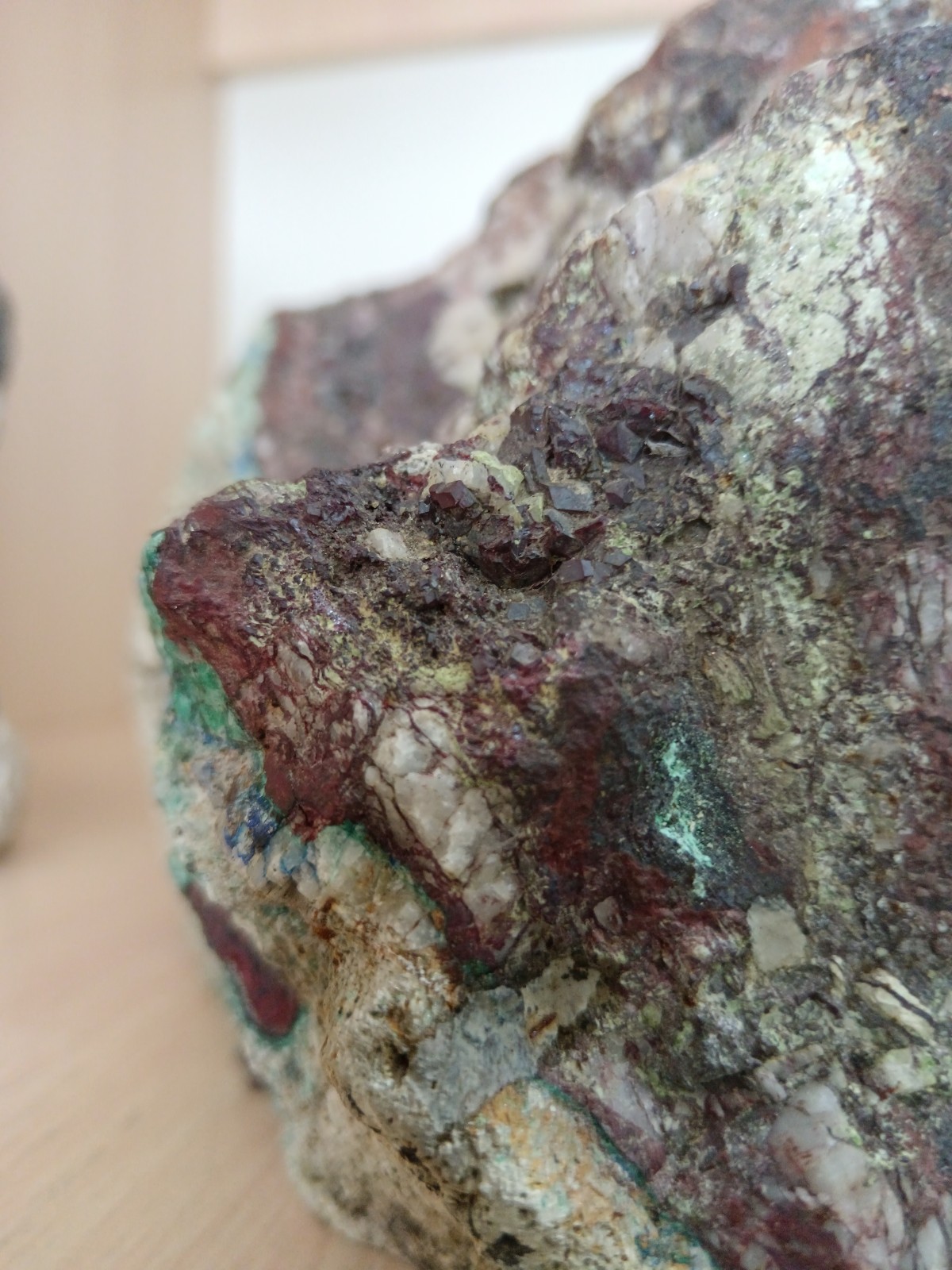 Кристаллы темно-красного просвечивающего куприта в молочном кварце пронизанном тонкими прожилками куприта, азурита и малахита. Образец из коллекции Краеведческого музея города Зыряяновск.