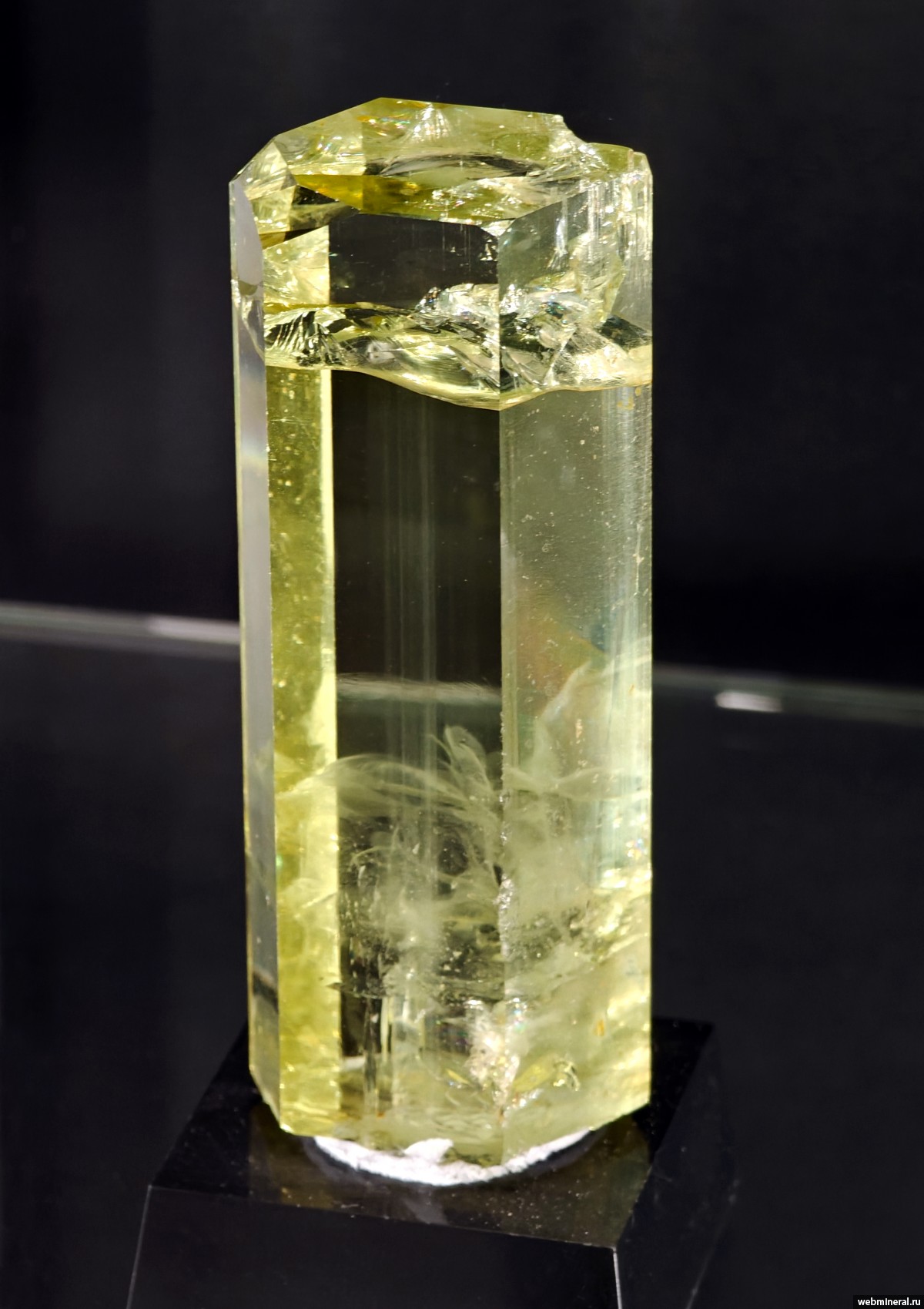 Кристалл гелиодора с вуалями газово-жидких включений и законсервированными каналами растворения в центральной части.
