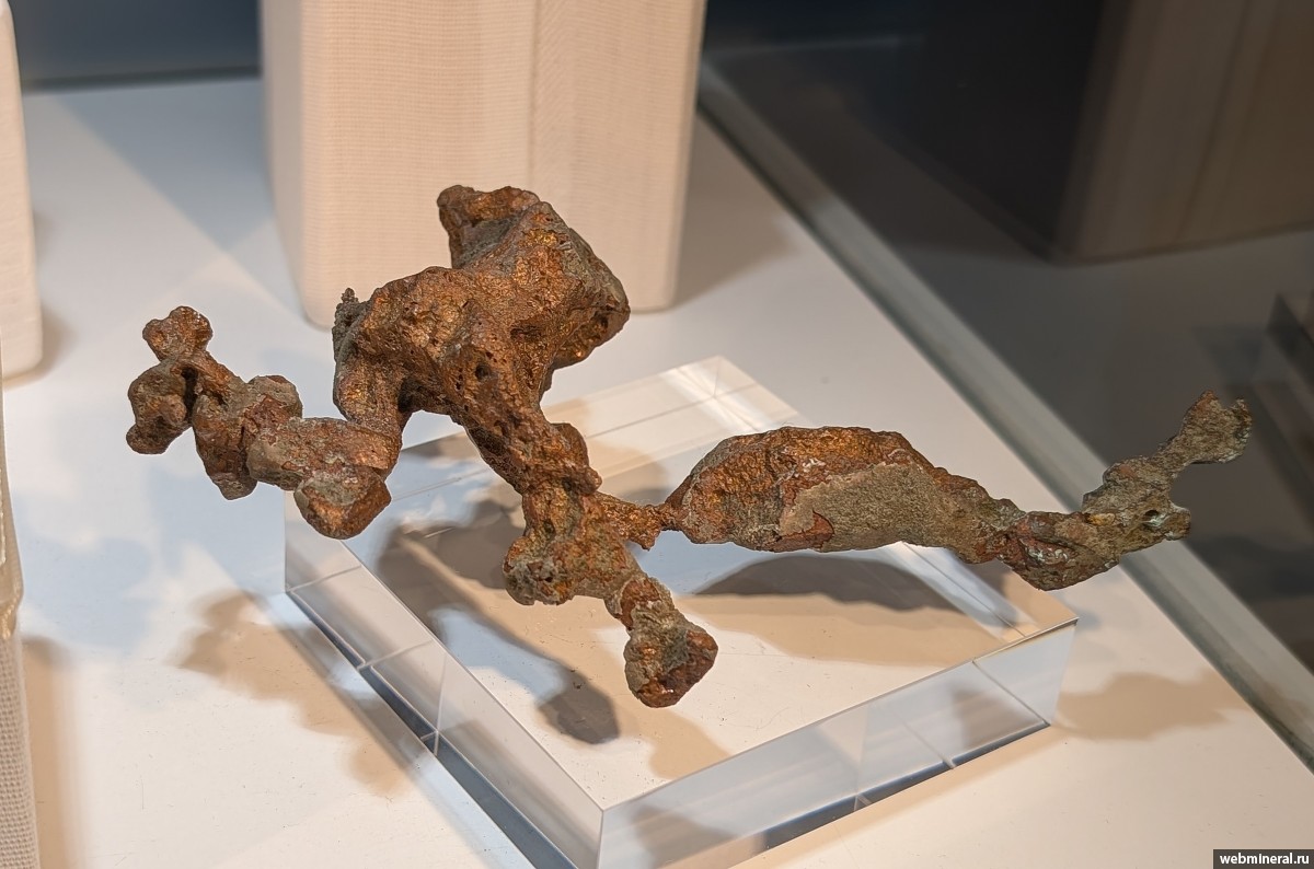 Дендритовоидный сросток грубых кристаллов самородной меди из трещины в базальте. Фото - Munich Mineral Show, 2025 год.