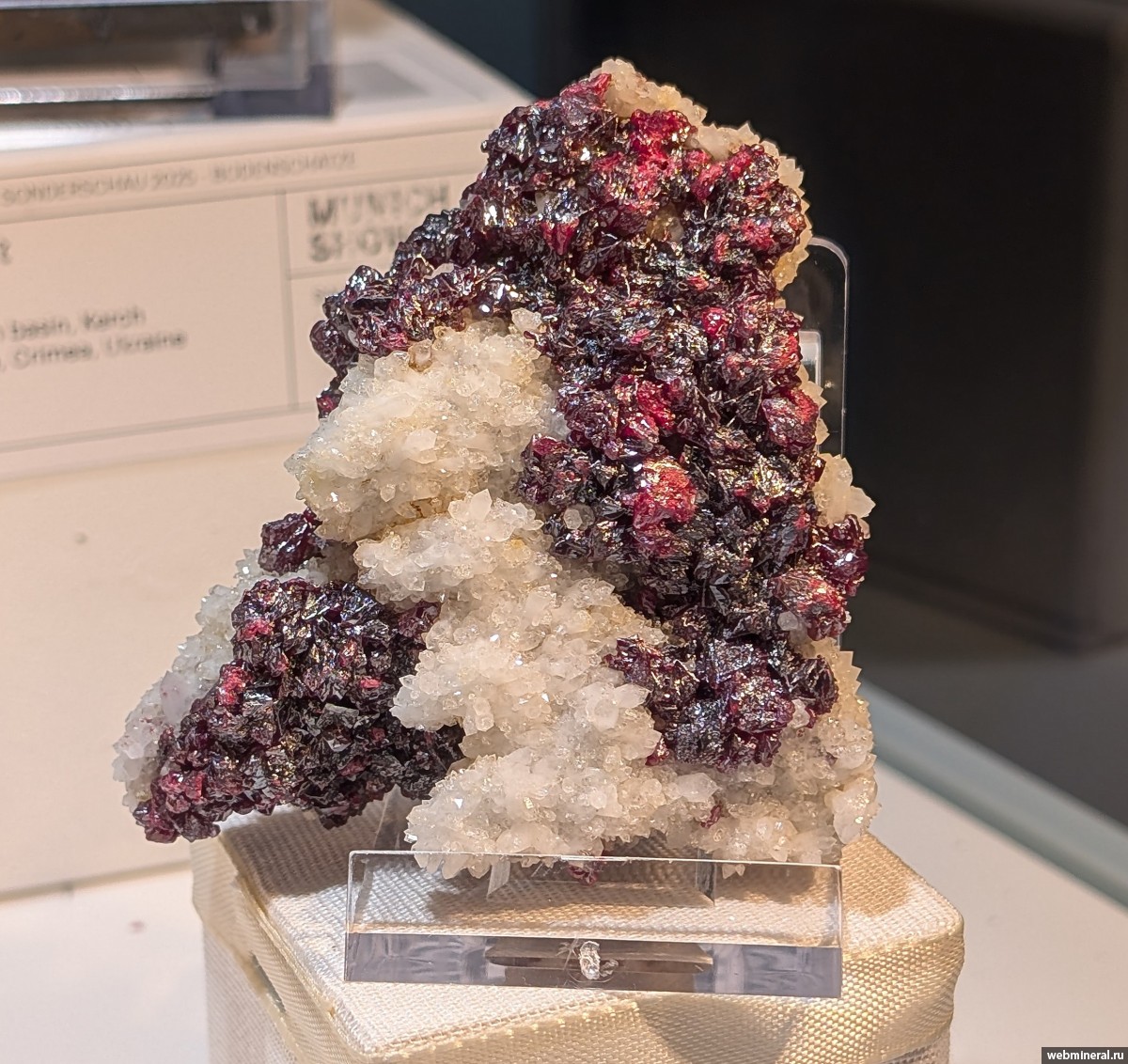 Друзовая корка сдвойникованных кристаллов киновари на белом кварце. Фото - Munich Mineral Show, 2025 год.
